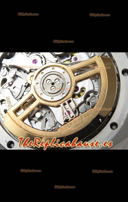 Disposición de la Maquinaria Idéntica al Movimiento Audemars Piguet Calibre 4401 utilizado en los Auténticos relojes Audemars Piguet Offshore.. Función de Cronómetro Funcional como como el auténtico con manecillas Segunderas corriendo en el Dial de las 12 en Punto. Función Flyback funcional, similar a la del reloj Original.
