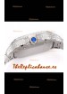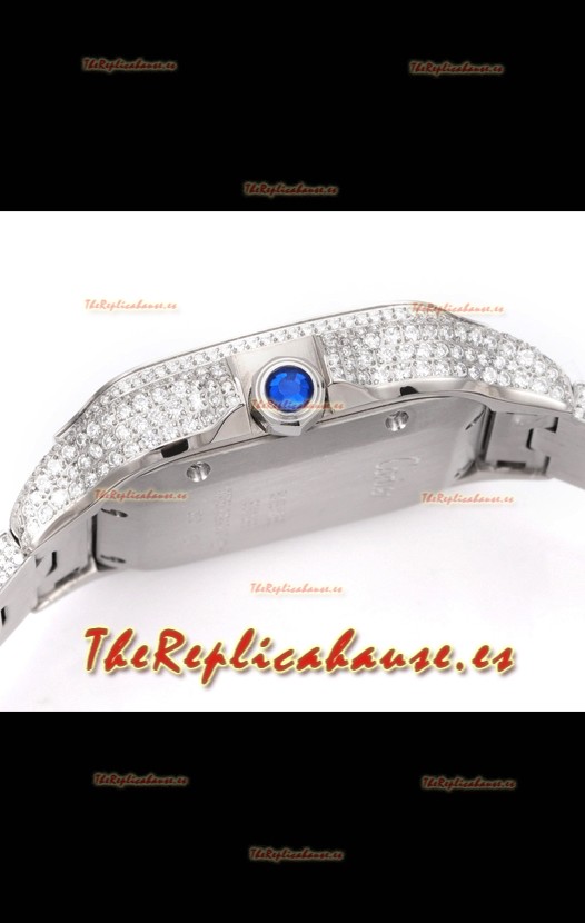 Dial con Diamantes Incrustados Numerales de Hora en Romanos, Ventana de Fecha a las 6 en Punto y marcas distintivas de Cartier en el contador de las 7PM. Zafiros azules en la punta del tallo.