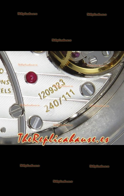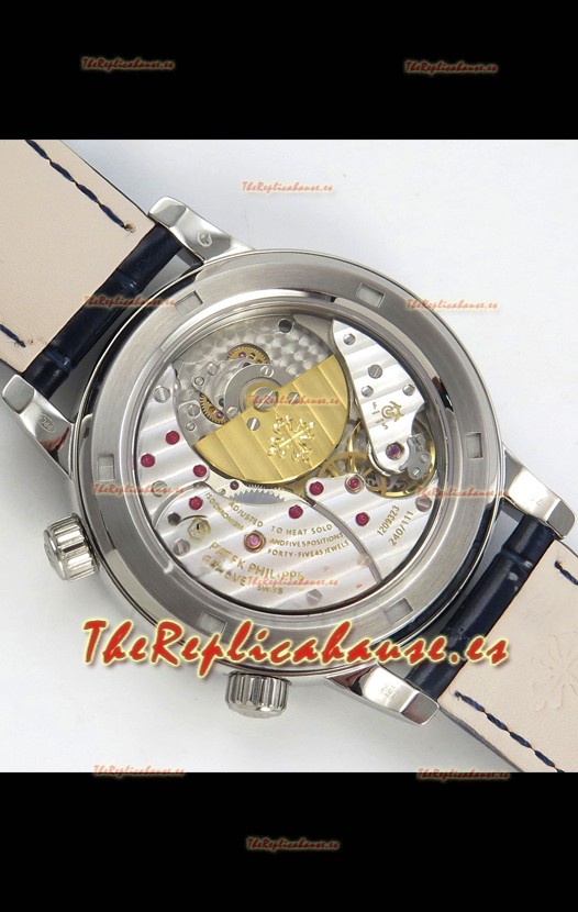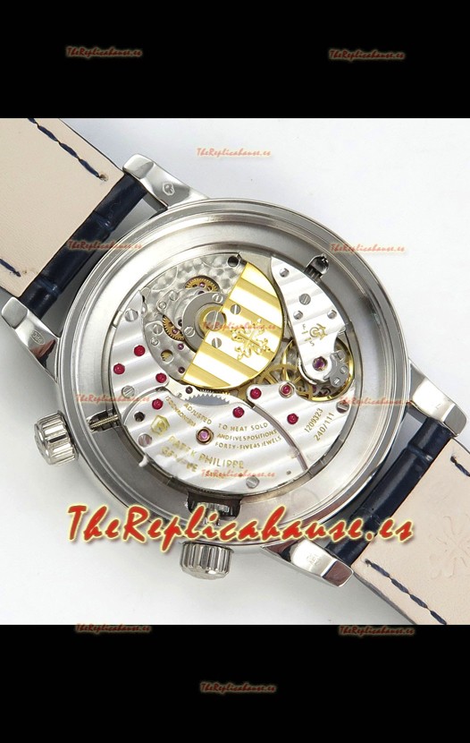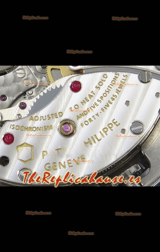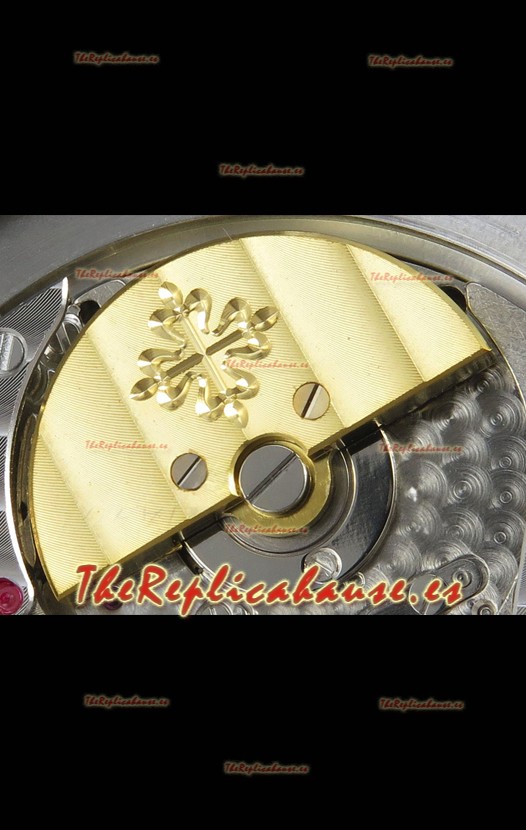 Genuino Movimiento Suizo 9015, Ensamblado para Parecerse al Movimiento Auténtico Patek Philippe PP 240 Calibre. Rotor, Puente y Grabados en el Movimiento actualizados, con Rotror chapado en Oro Rosado con el sello Patek Philippe.