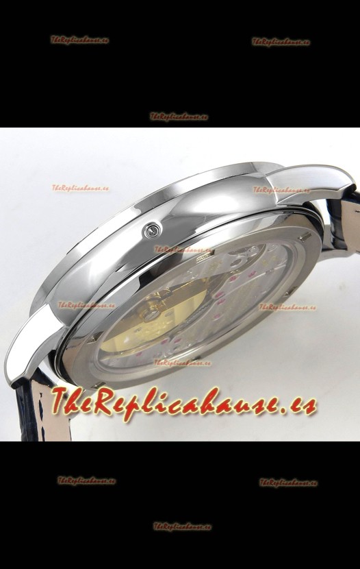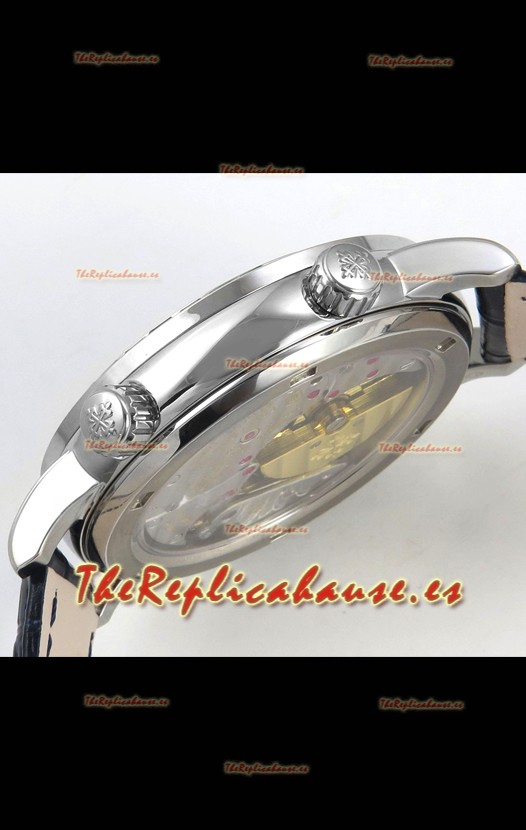 Fecha es Ajustable en la Corona de las 2 en Punto, Fase Lunar se ajusta a través de la Corona a las 4 en Punto (Fase Lunar es un Indicador Dia/Noche y no la Fase Lunar encontrada en los Relojes Patek Philippe Original 6120P)