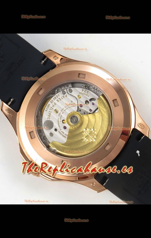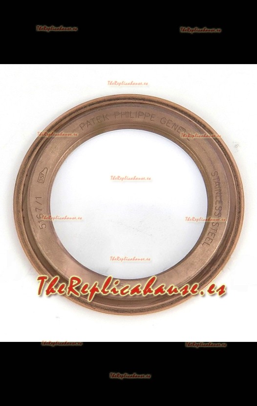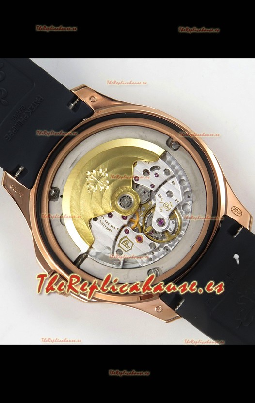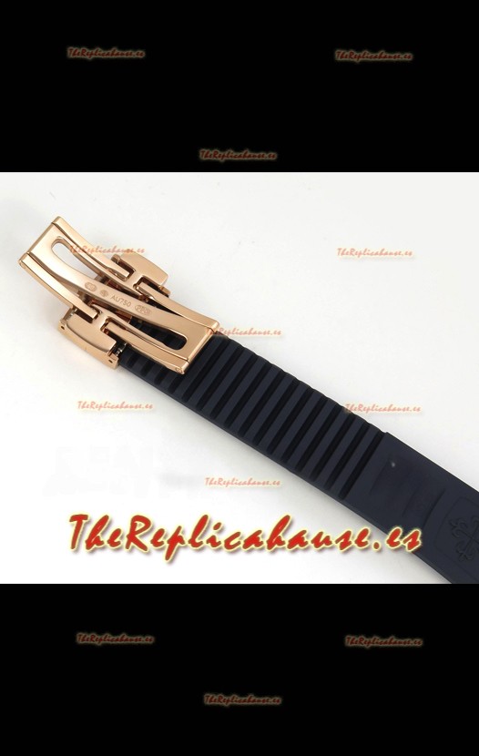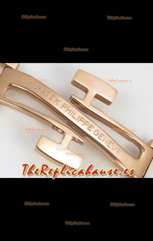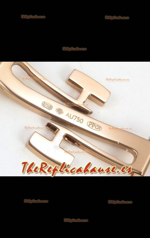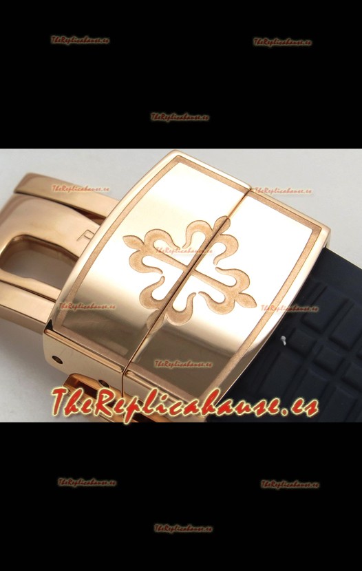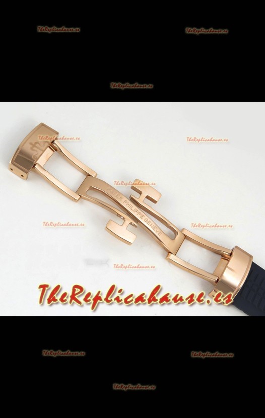 Correa de Goma Curvada Marrón con Cierre Plegable de Acero chapado en Oro Rosado completada con Marcas y grabados Patek Philippe. Un Cierre Muy Actualizado para esta serie con marcas/grabados mucho más precisas.
