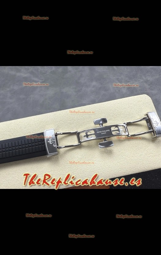 Correa de Goma Curvada con Cierre Plegable completada con Marcas y grabados Patek Philippe. Un Cierre Muy Actualizado para esta serie con marcas/grabados mucho más precisas.