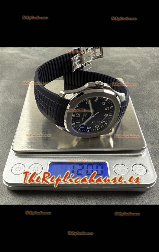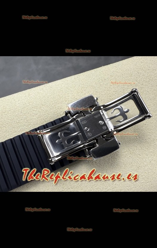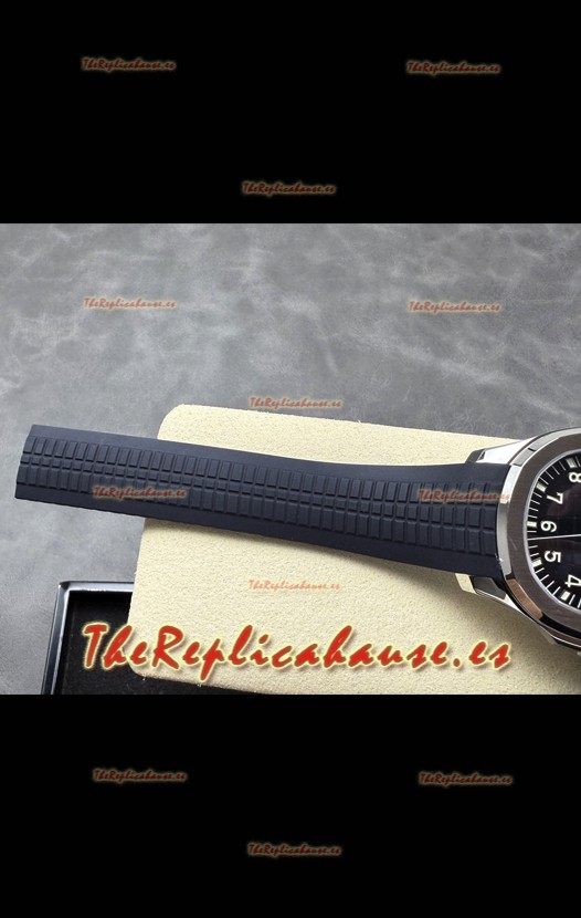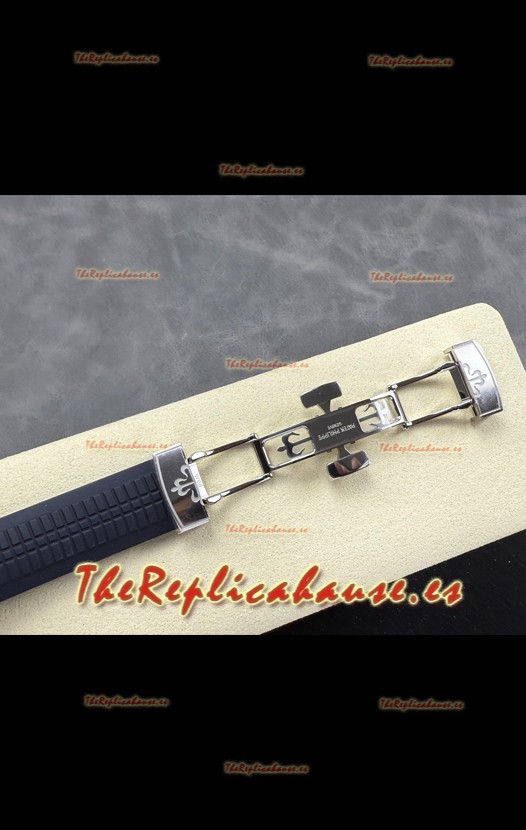 Correa de Goma Curvada Azul con Cierre Plegable completada con Marcas y grabados Patek Philippe. Un Cierre Muy Actualizado para esta serie con marcas/grabados mucho más precisas.