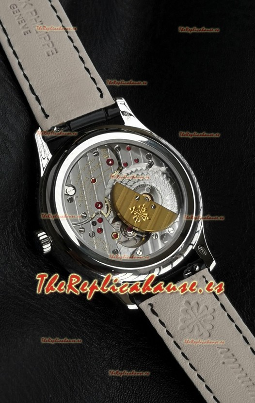 Movimiento Suizo Genuino 9015 ensamblado para parecerse al movimiento auténtico Patek Philippe estilo calibre PP 324. Rotor, puente y Grabados actualizados en el movimiento con rotor bañado en Oro Rosado con el sello de Patek Philippe