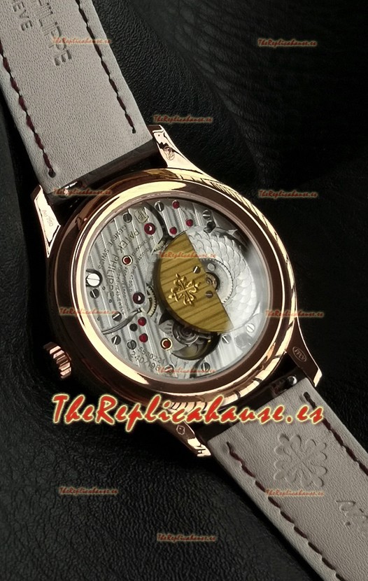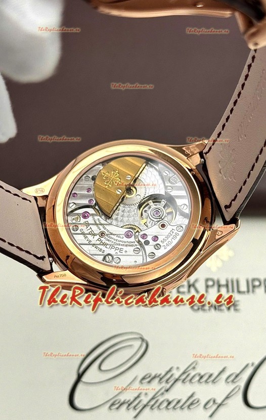 Movimiento Suizo Genuino 9015 ensamblado para parecerse al movimiento auténtico Patek Philippe estilo calibre PP 324. Rotor, puente y Grabados actualizados en el movimiento con rotor bañado en Oro Rosado con el sello de Patek Philippe