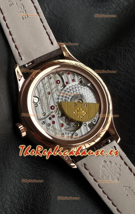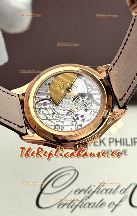 Movimiento Suizo Genuino 9015 ensamblado para parecerse al movimiento auténtico Patek Philippe estilo calibre PP 324. Rotor, puente y Grabados actualizados en el movimiento con rotor bañado en Oro Rosado con el sello de Patek Philippe
