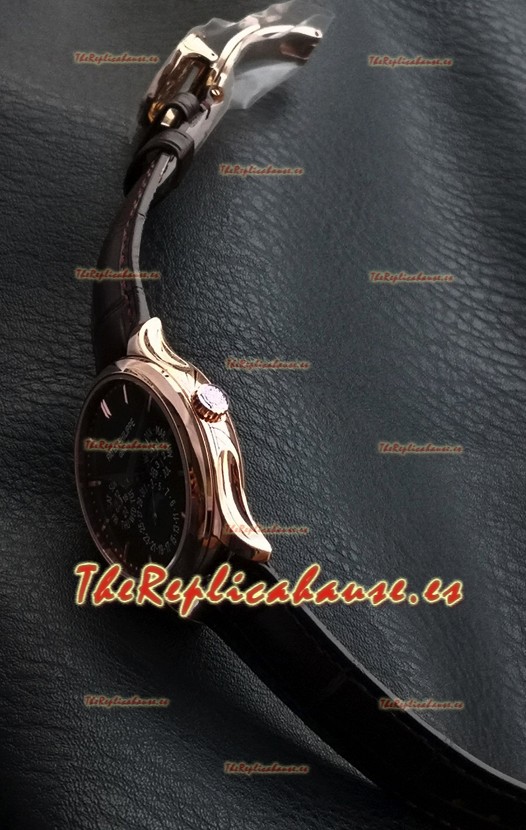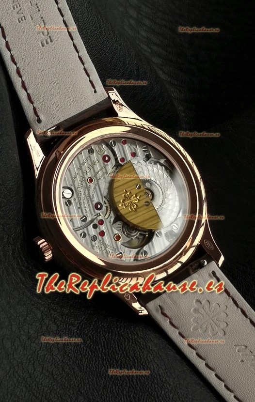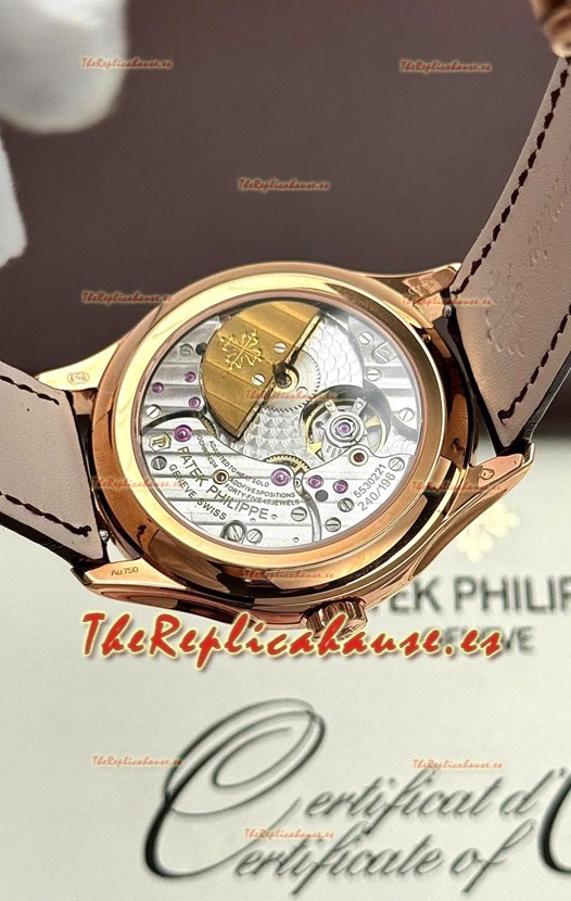 Movimiento Suizo Genuino 9015 ensamblado para parecerse al movimiento auténtico Patek Philippe estilo calibre PP 324. Rotor, puente y Grabados actualizados en el movimiento con rotor bañado en Oro Rosado con el sello de Patek Philippe