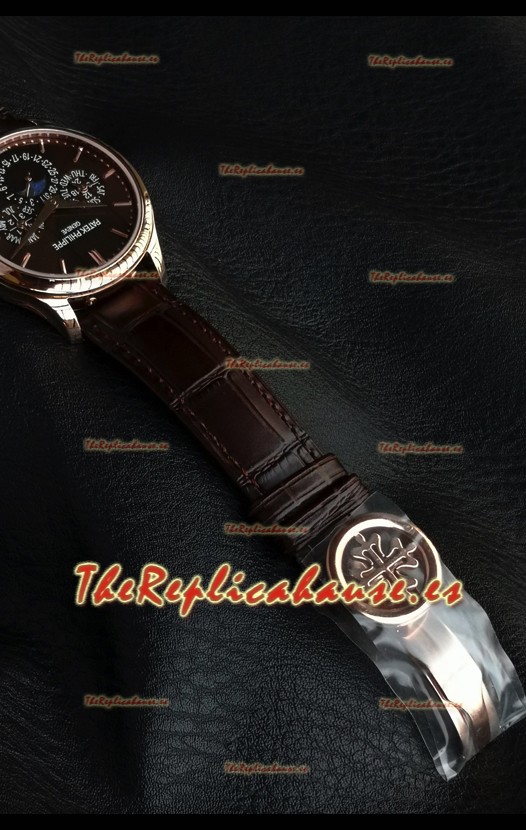 Genuina Correa de Piel con Cierre Plegable chapado en Oro Rosado completada con Marcas y grabados Patek Philippe.