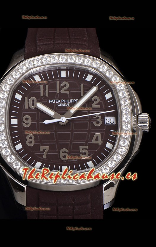 Dial Texturizado y Colorizado Marrón con Ventana de Fecha a las 3 en Punto. Bisel de Diamantes