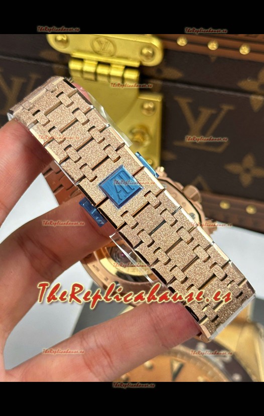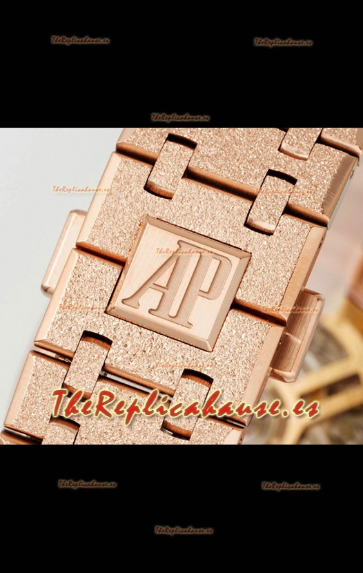 Correa Acero Inoxidable 904L chapada en Oro Rosado Esmerilado completada con Marcas y Grabados AP como los originales y cierre desplegable AP
