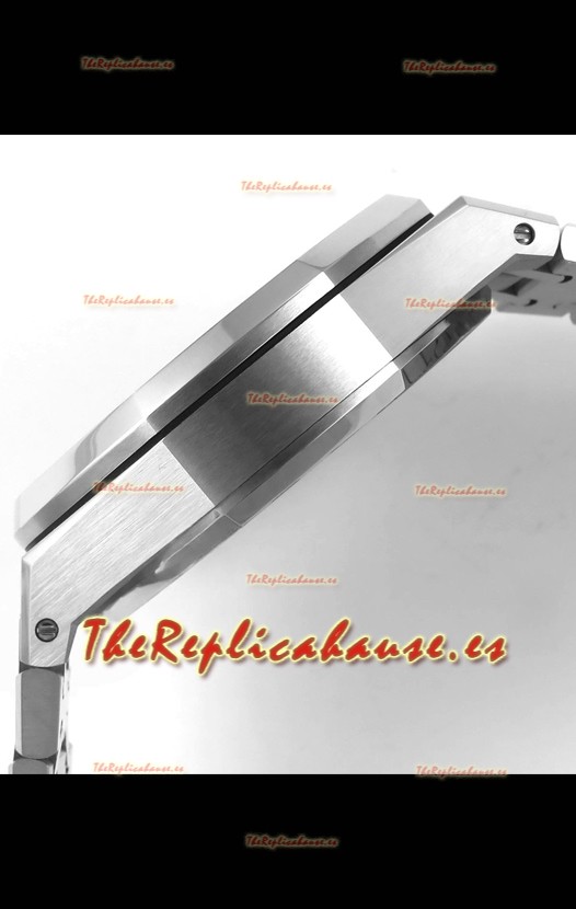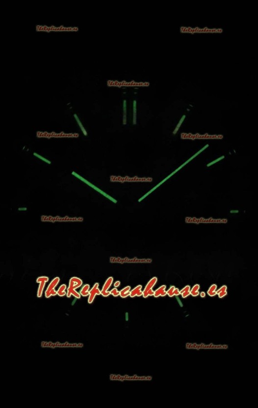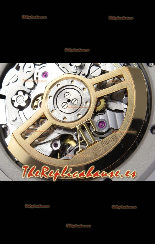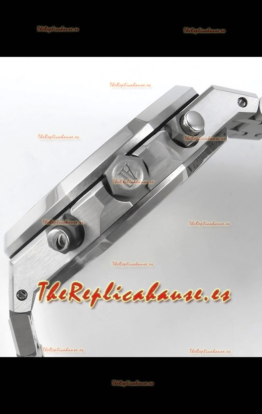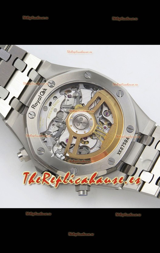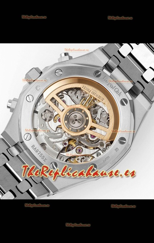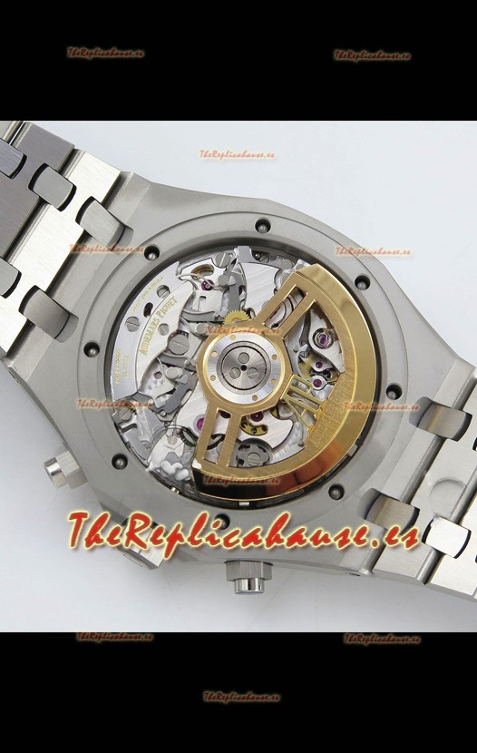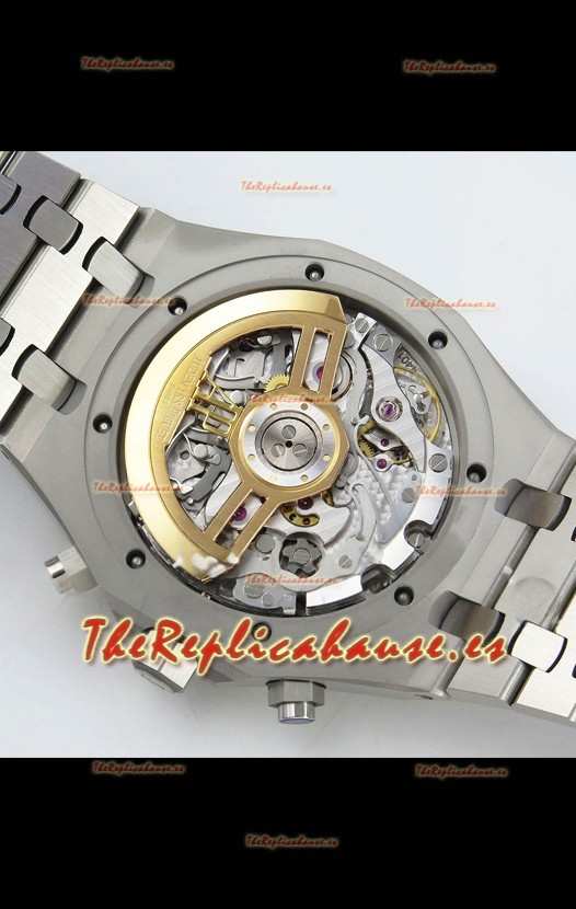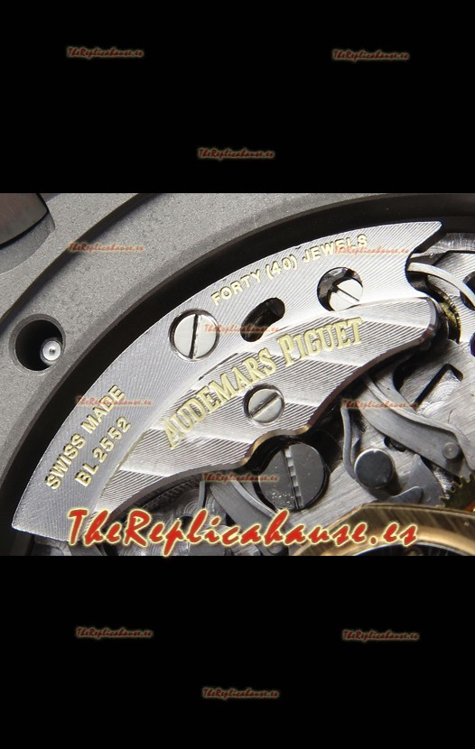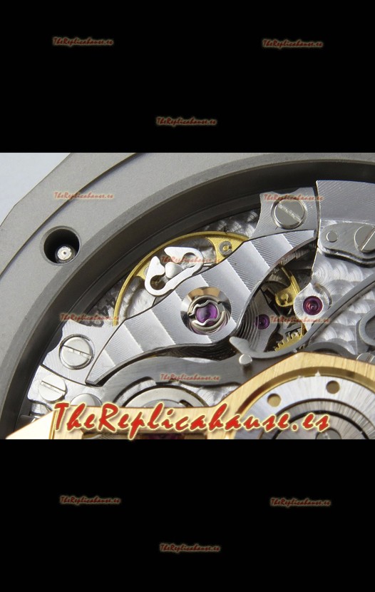 Disposición de la Maquinaria Idéntica al Movimiento Audemars Piguet Calibre 4401 utilizado en los Auténticos relojes Audemars Piguet Offshore.. Construido sobre la Genuina Arquitectura del Movimiento Suizo 7753 con Función de Cronómetro Funcional como como el auténtico con manecillas Segunderas corriendo en el Dial de las 12 en Punto