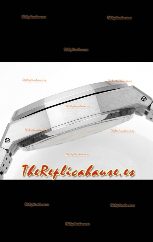 Caja de Acero 904L chapada en Oro Blanco Esmerilado completada con Marcas y Grabados AP.