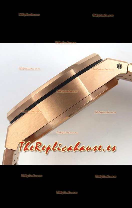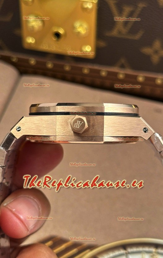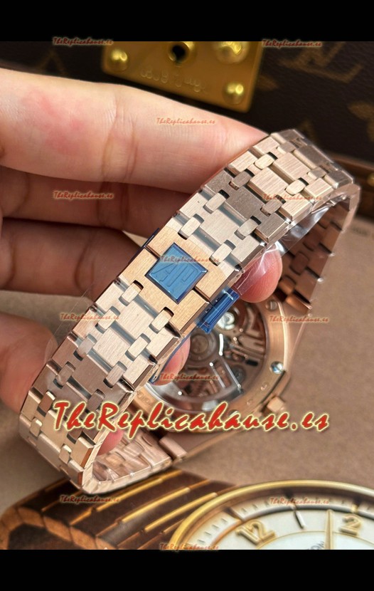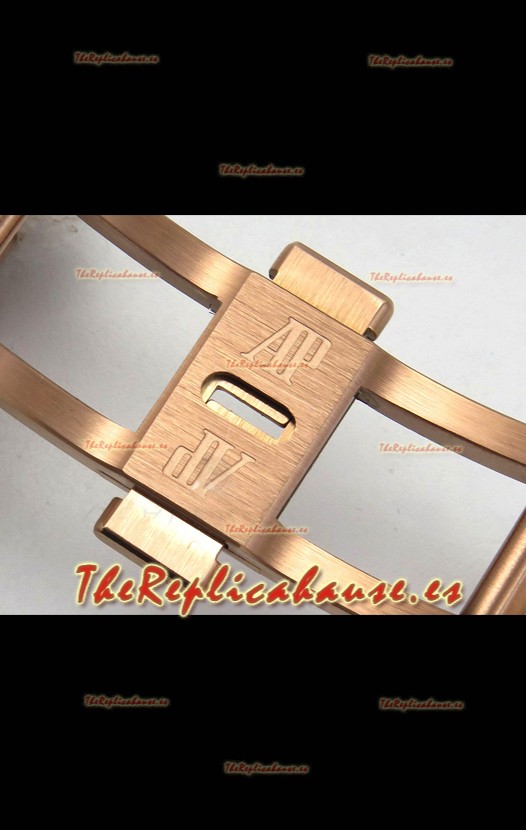 Correa de Acero Inoxidable 904L Chapada en Oro Rosado completada con Marcas y Grabados Audemars Piguet y Cierre con la firma AP