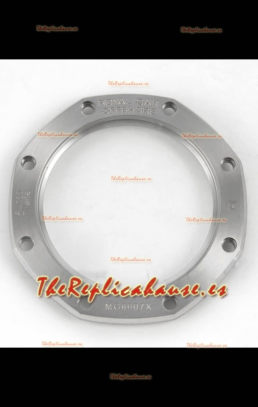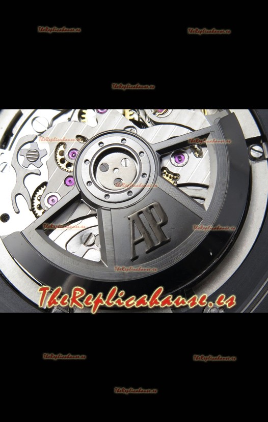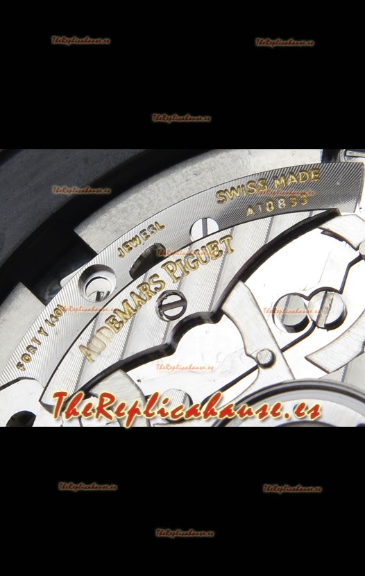 Disposición de la Maquinaria idéntica a la del Movimiento Audemars Piguet 3126 Calibre utilizado en los Relojes Auténticos Audemars Piguet Offshore, fabricado con la arquitectura del Genuino movimiento Suizo 7753, con cronómetro funcional como el original