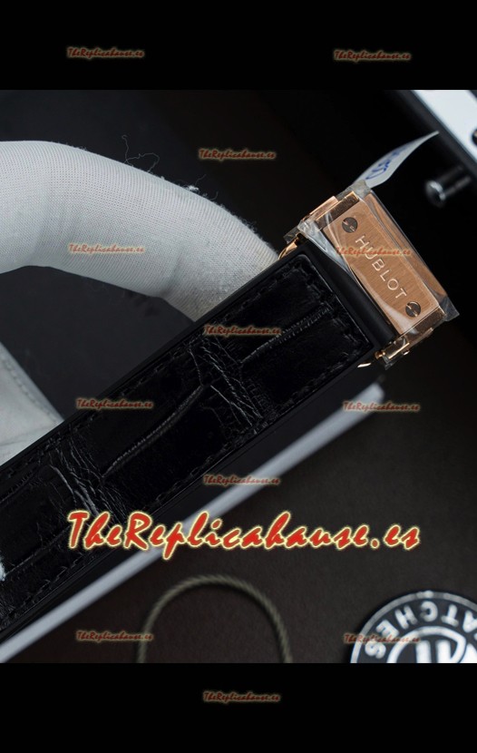 Correa de Piel de Cocodrilo con Cierre Desplegable en Oro Rosado completado con Marcas y Grabados Hublot