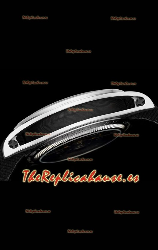 Dial Aventura con 3 Sub Diales Funcionales, como el Auténtico. Bisel Blanco de Zafiros a Prueba de Rasguños con Marcas Mejoradas que tiene exactamente las mismas fuentes y marcas níticas que el Original.