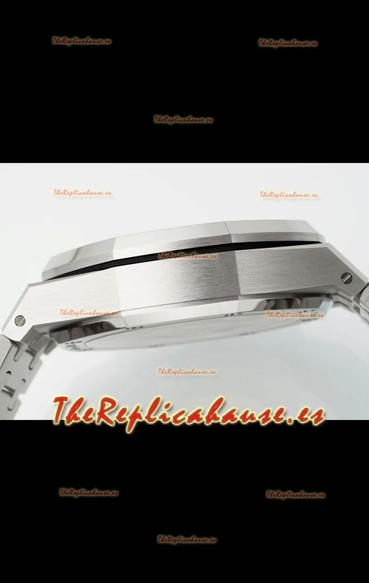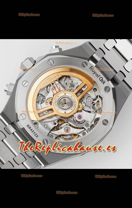 Disposición de la Maquinaria Idéntica al Movimiento Audemars Piguet Calibre 4401 utilizado en los Auténticos relojes Audemars Piguet Offshore.. Construido sobre la Genuina Arquitectura del Movimiento Suizo 7753 con Función de Cronómetro Funcional como como el auténtico con manecillas Segunderas corriendo en el Dial de las 12 en Punto