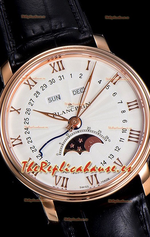 Blancpain "Villeret Quantième Complet" Caja de Acero 904L chapada en Oro Rosado Dial Blanco