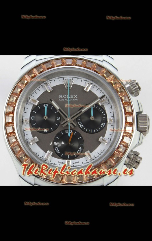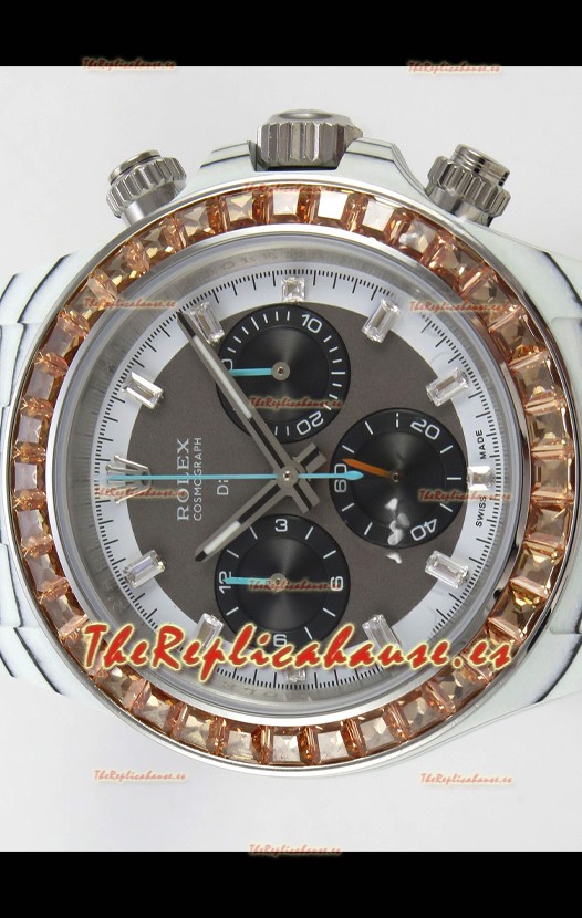 Dial Gris. Tres Sub Diales Funcionales que funcionan en conjunto con la función de cronómetro, como en los originales. Sapphires Bezel