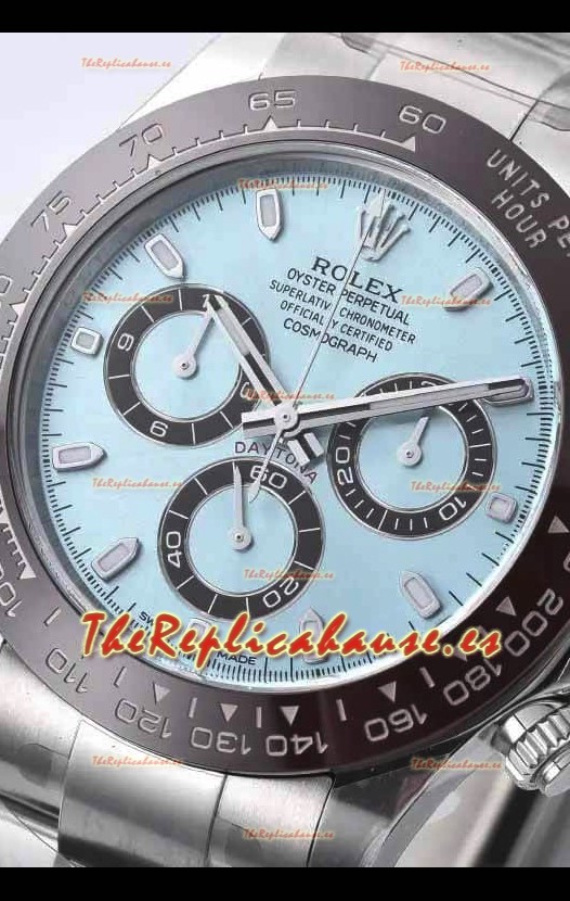 Dial Azul Ice 3 Sub Diales Funcionales como en los Auténticos. Bisel de Cerámica Negro con Marcas Mejoradas a prueba de Rasguños, que tiene exactamente las mismas fuentes y marcas níticas que el original.