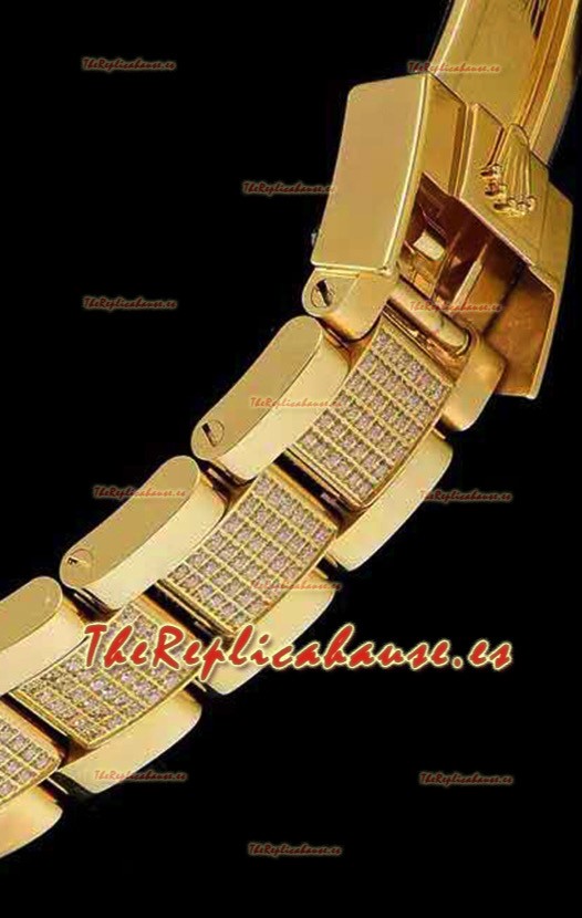 Correa de Acero 904L chapada en Oro Amarillo de 18K con con Cierre abatible nuevo estilo Flip-Lock perfectamente replicado completado con Marcas y Grabados Rolex como en el Genuino